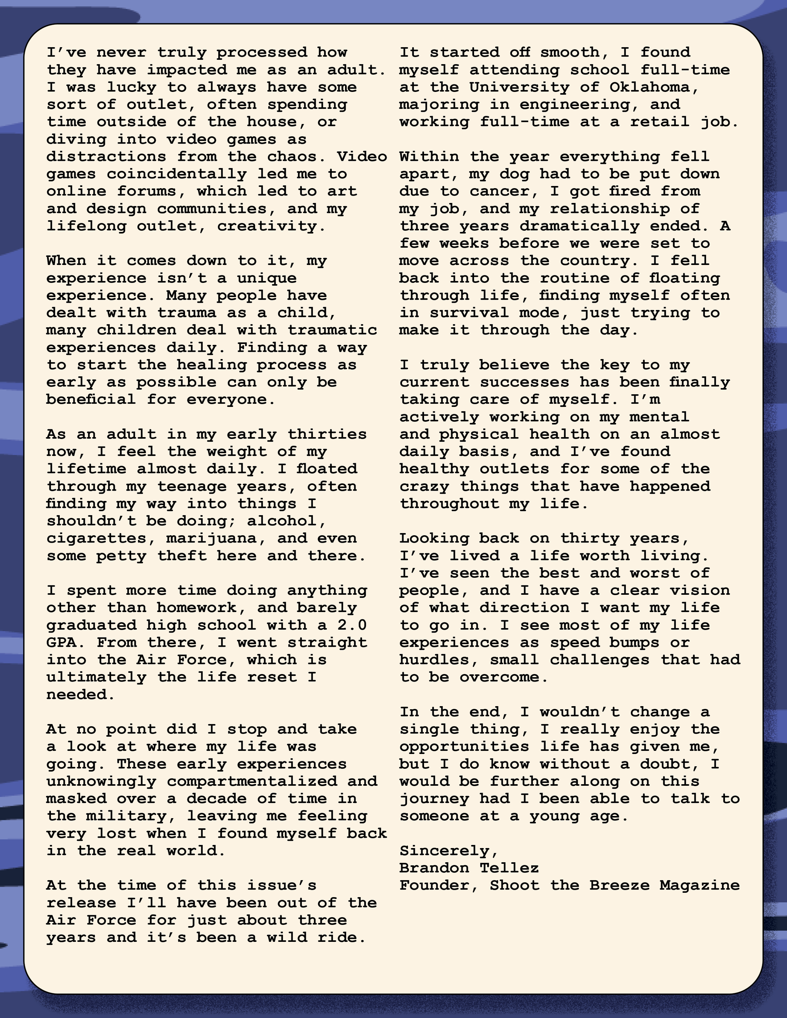 Shoot the Breeze Magazine is about connecting people. On any given day, you may pass by a hundred different human beings, each with a unique story, a unique set of events that have built them into the person they are today. We all have different backgrounds, different experiences, different traumas, joys, dreams, and wants. In passing, we often don't personify these human beings though, they are their title, their situation, their issues. Think about the last time you were frustrated while driving. I'm sure you didn't see that "asshole in the Subaru" as a person, they were the actions they took, and you probably couldn't even see their face. This goes so much past driving though, the CEO of your company, the barista at the coffee shop, the person with a sign asking for help when you get off the highway. Your favorite musician, Twitch streamer, Youtuber, movie star, author, teacher, coach, parent. Everyone has a unique story, a unique set of events that have built them into the person they are today